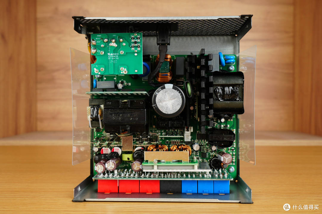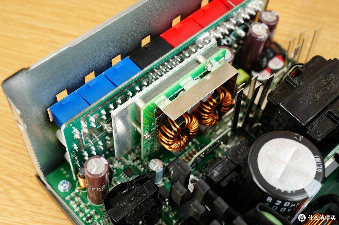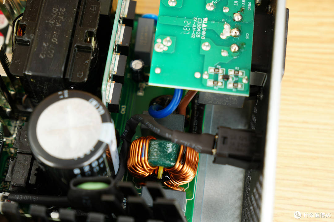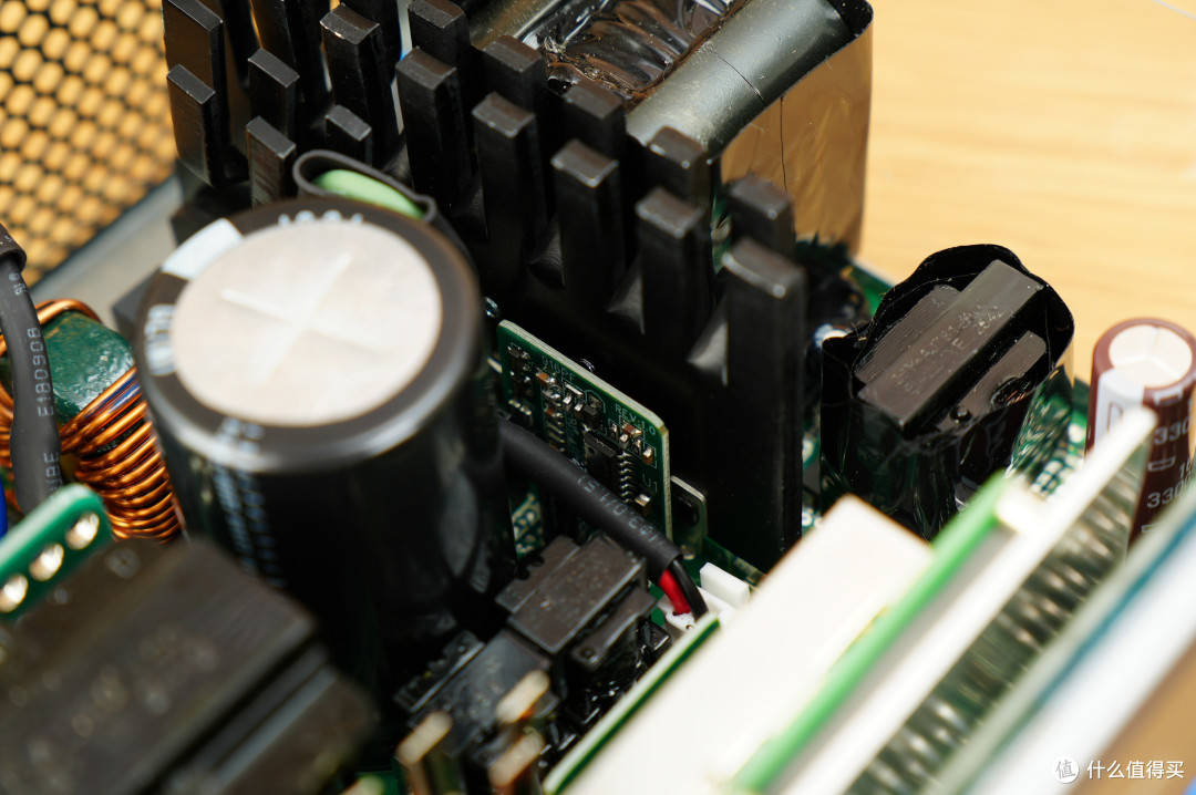 电源内部为非常典型的主动式PFC+全桥LLC谐振+同步整流+DC-DC结构,内部空间利用率比较高,元件排列紧凑,有不少地方都采用了立式PCB设计。