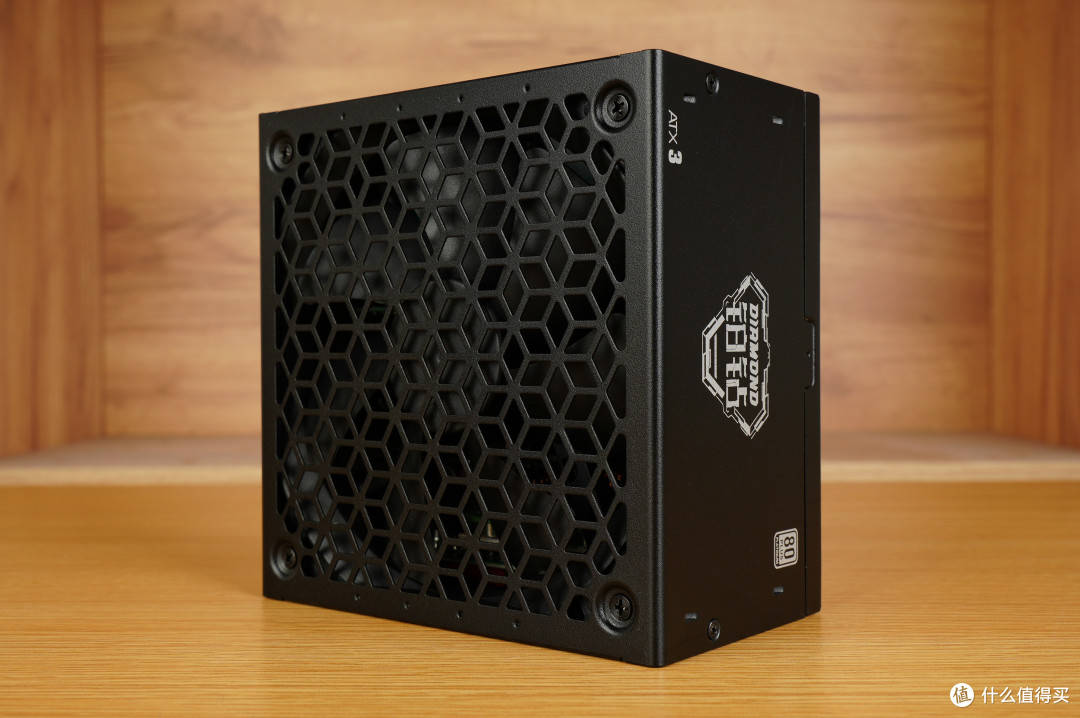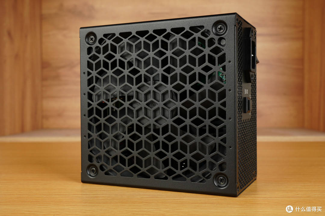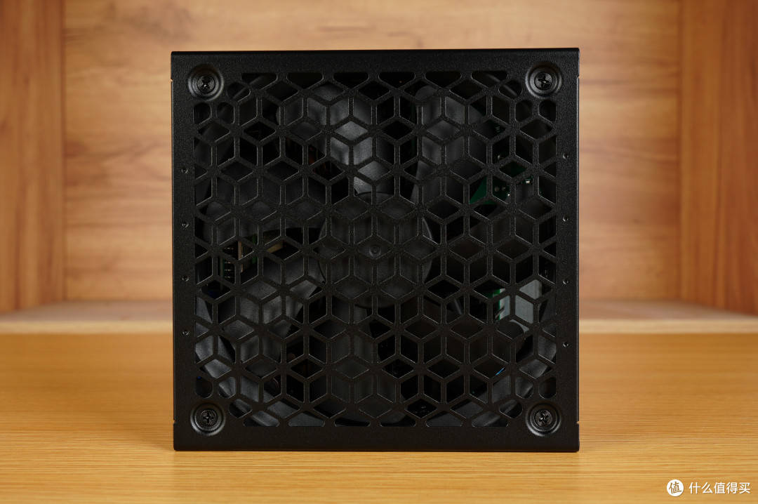 先马铂钻系列电源的进风罩形状设计跟之前的先马黑洞系列电源基本一致,都是由菱形和平行四边形组成,像放大了许多的蜂窝结构类似。