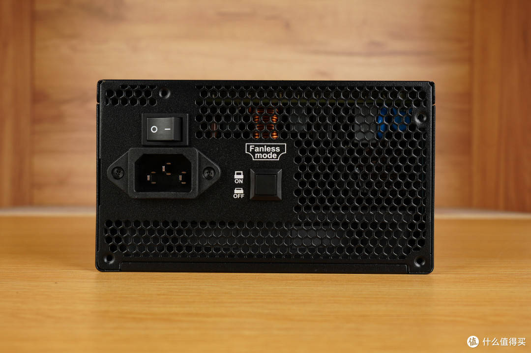 风扇支持自启停技术,在打开机身尾部的“Fanless mode”按钮后,在负载低于550W的时候可以实现停转运作;在功耗介于550°C~1000°C的时候转速缓慢上升,直至达到1000W时候才会达到最高约1600RPM的转速。电源的AC输入接口带有独立开关,开关质感非常不错。电源支持100-240V的输入电压,毫无疑问这是一款宽幅电源,不过这也是基本操作了,毕竟要想通过80Plus认证这是必要的功能。