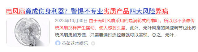 大量无叶风扇为控制成本,核心零部件选材简陋、制作工艺粗糙,电路设计也缺乏科学性,这就增加了触电、火灾的风险,危及用户的人身安全。同时,这类产品还可能因材质问题出现发霉、滋生细菌的情况,甚至散发塑胶味等异味,吹出的风中可能夹杂有毒有害物质,造成空气二次污染,进一步影响人体健康。
