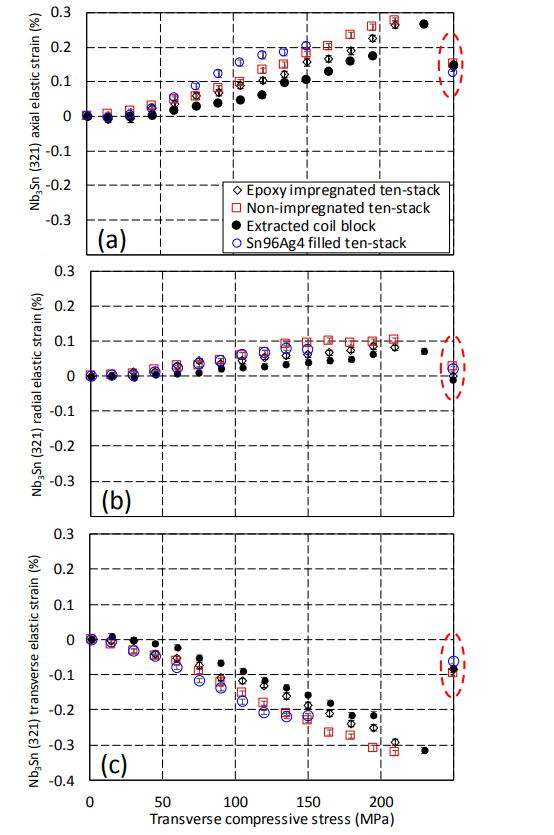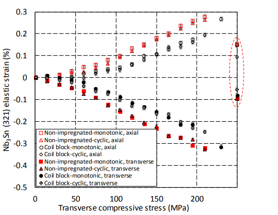 图7. 在单调和循环加载下,作为横向施加压缩应力函数的 Nb₃Sn(321)横向和轴向加载应变演变的比较。使用了两个相同的非浸渍十堆样品和两个相同的线圈块样品。用红色虚线圈出的数据点是在释放外部应力后测量的。