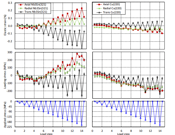 图6. 非浸渍十堆样品在循环施加横向压缩应力下,轴向、径向和横向方向上 Nb₃Sn(321)和铜(220)的加载应变和应力演变。下图显示了加载循环。