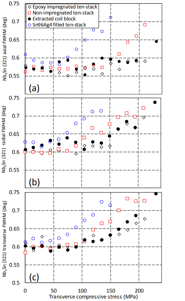 图5. 在施加横向压缩应力期间,(a)轴向、(b)径向和(c)横向方向上 Nb₃Sn(321)衍射峰宽(FWHM)演变的比较。