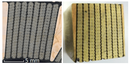 用 Sn96Ag4 填充电缆堆叠会在横向压缩下产生强烈的屈曲,如图3所示的断层扫描横截面。Sn96Ag4 填充的十堆样品中的 Nb₃Sn 应变甚至高于未浸渍电缆堆叠中的应变。在环氧树脂浸渍的样品中测得的 Nb₃Sn 加载应变最低。