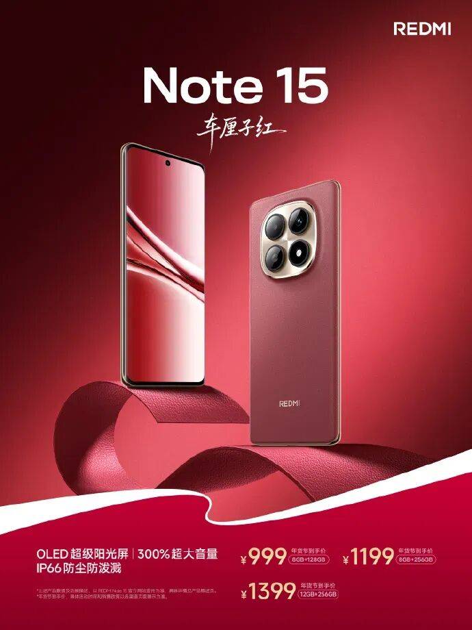 售价方面,REDMI Note 15 车厘子红,8GB+128GB到手价 999 元;8GB+256GB到手价 1199 元;12GB+256GB到手价 1399 元。