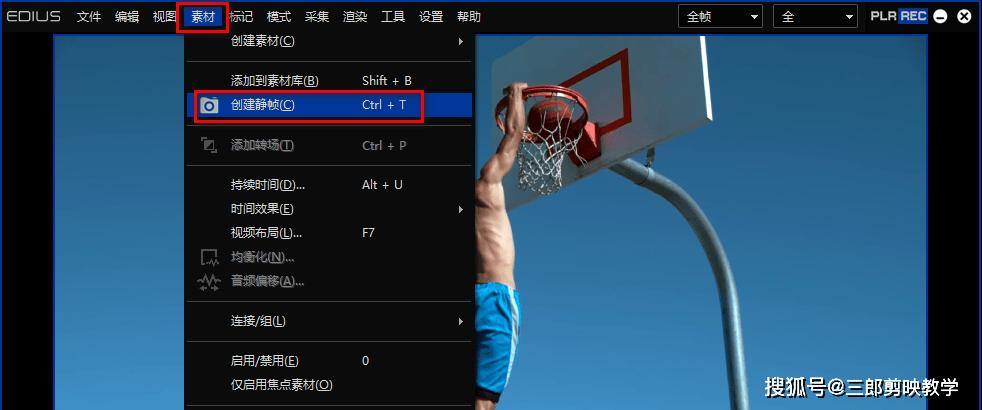步骤二,将指针移动到需要生成图片的那一个画面,然后单击菜单栏“素材”里的“创建静帧”,快捷键是Ctrl+T,如下图所示;