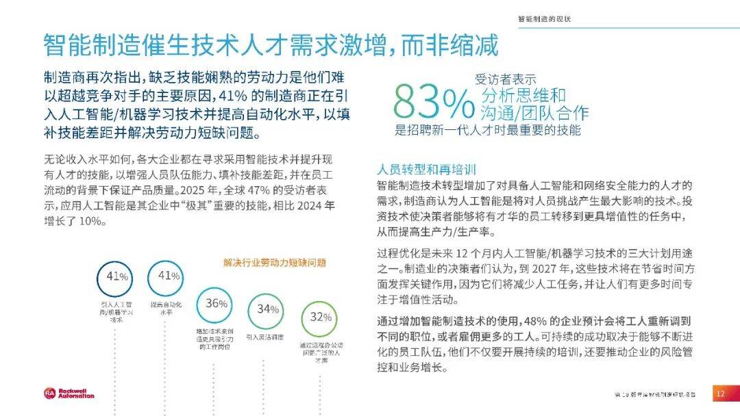 在制造业前沿,由人工智能、大数据与自动化技术引领的变革正蓬勃展开。智能制造已从概念变为生产力,20%的制造商实现其规模化应用,另有20%计划未来12个月内投资。它成为制造业新引擎,应对劳动力短缺、技能差距等挑战。41%的受访企业引入人工智能和机器学习填补技能与劳动力缺口,这催生了对技术人才的大量需求,83%的企业将分析思维和沟通能力视为招聘核心要素。未来五年,人工智能和网络安全知识结合成企业最需技能,47%的企业认为网络安全技能重要,高于2024年的40%。智能制造催生技术人才需求,41%企业引入相关技术填补技能差距,32%企业通过技术创造吸引力岗位,34%企业借远程办公扩大人才库。同时,48%企业会岗位调整或增员,成功依赖技术与可进化员工队伍。