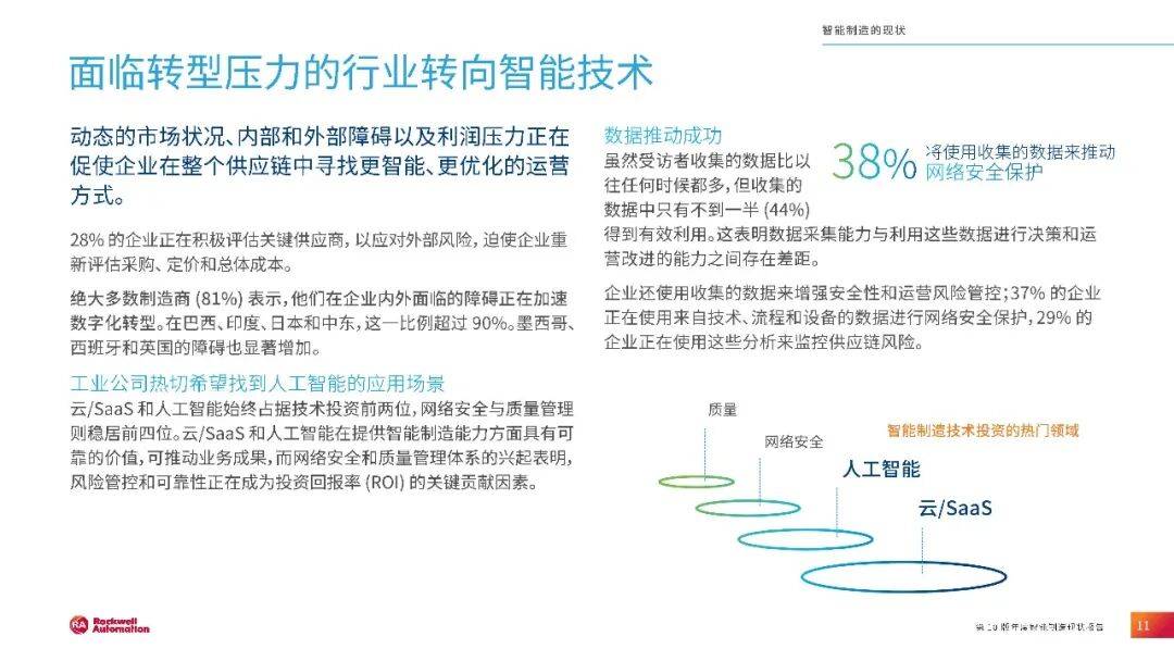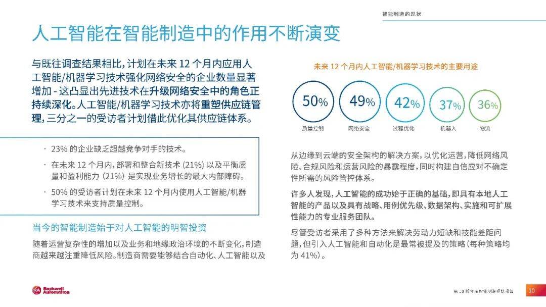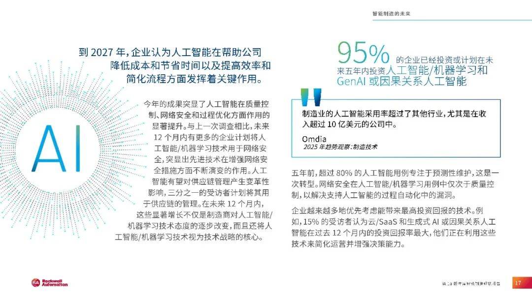 智能制造技术推动行业转型,制造业人工智能采用率超其他行业,尤其在收入超10亿美元💵大公司中,成竞争新高地。但中小企业也在探索应用,69%未采用该技术受访者计划未来12个月投资,以提升竞争力。