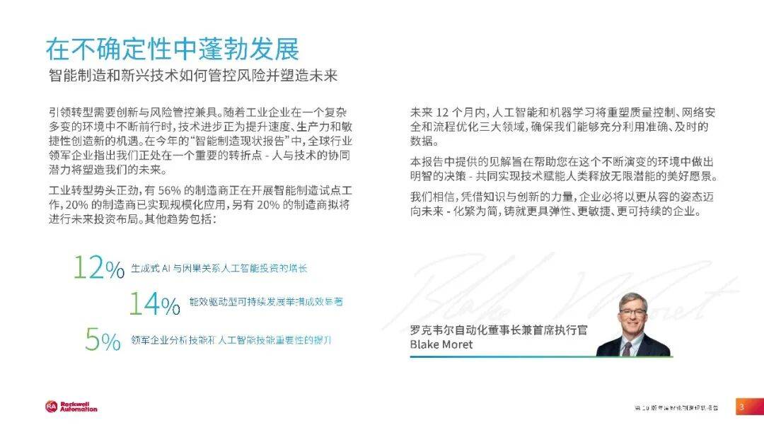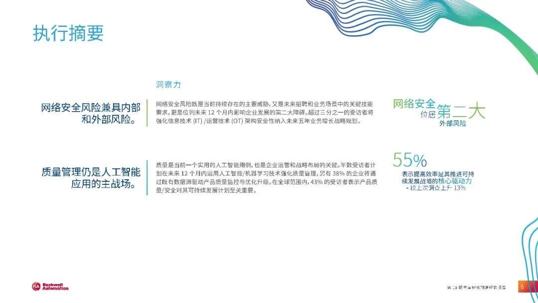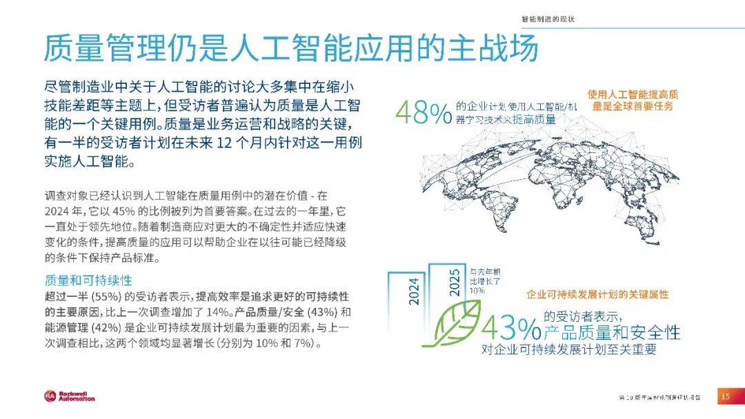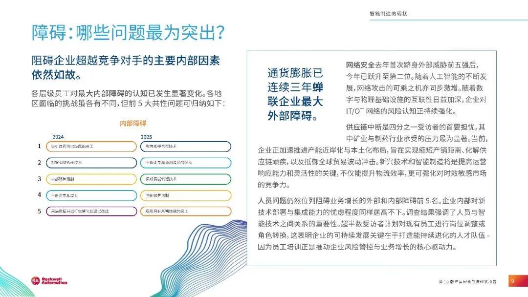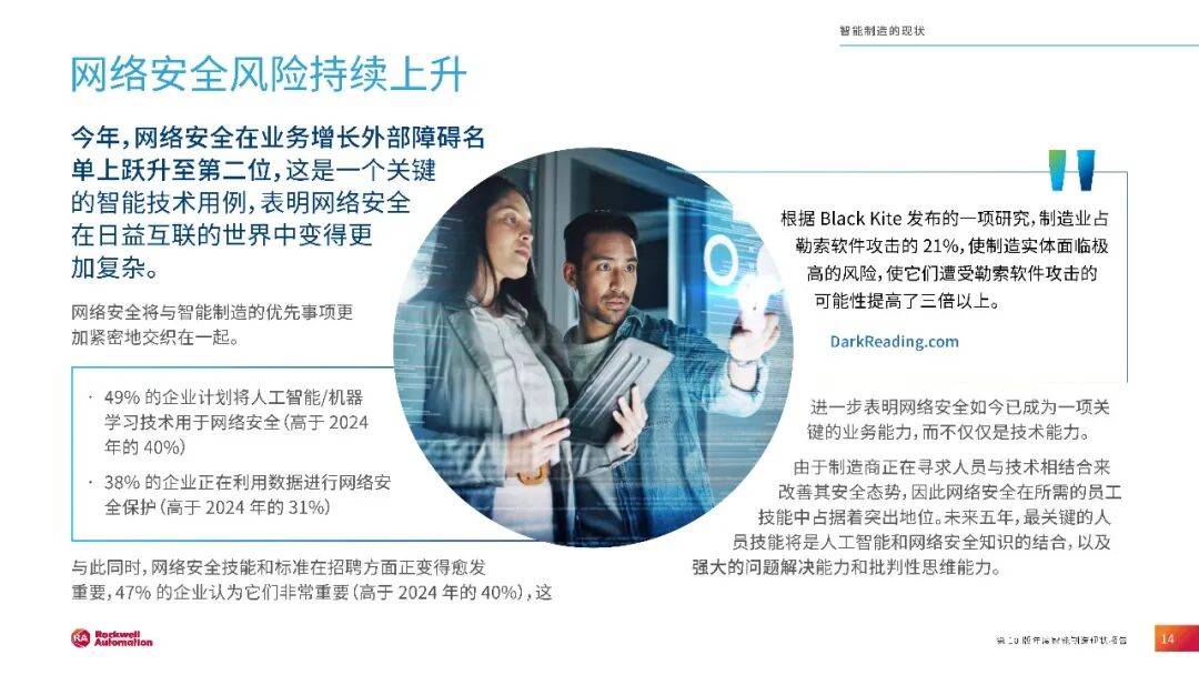 人工智能在智能制造作用凸显,未来12个月,50%企业计划用其支持质量控制,49%用于网络安全,38%利用数据保护网络安全。质量控制领域,半数受访者计划12个月内用人工智能强化质量管理,38%企业靠既有数据优化质量监控。网络安全风险随智能制造普及上升,成企业发展第二大障碍,制造业占勒索软件攻击21%,企业需人员与技术结合改善安全态势。数据方面,38%企业用数据保护网络安全,28%评估供应商应对外部风险,但数据采集与利用数据决策、运营改进间有差距。企业需建从边缘到云端安全架构,降低网络、合规、运营风险,同时培养员工数据素养助力决策。