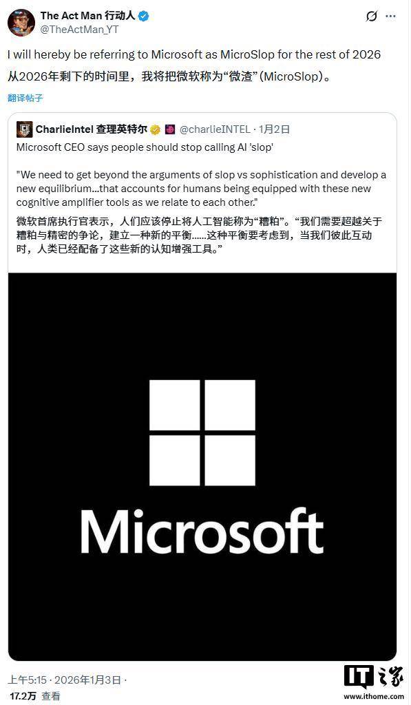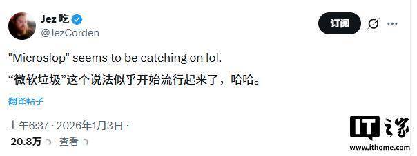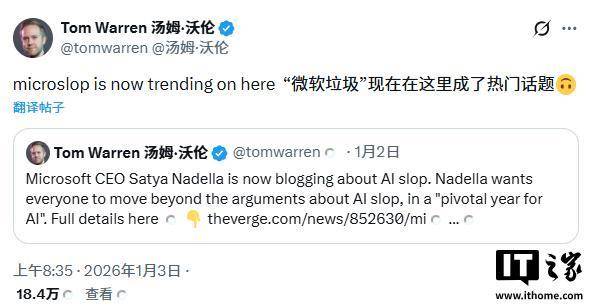 如此看来,整个社会显然并未如纳德拉所期望的那样,做好接纳人工智能的准备。在媒体发布相关报道后,“微软垃圾”(Microslop)一词于昨日在『社交平台』 X 上迅速成为热门话题。