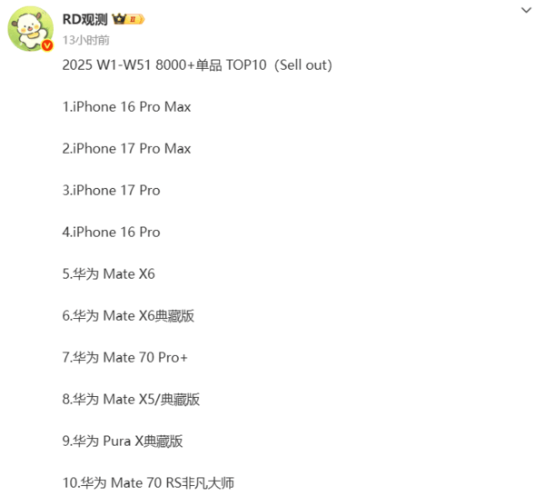 【CNMO科技消息】近日,博主“RD观测”曝光了一份2025年第1周至第51周(W1-W51)中国手机市场8000元以上价位段单机型销量TOP10排行榜。榜单清晰揭示了当前超高端『智能手机』市场的固化格局:苹果与华为两大巨头垄断了全部前十席位,其他品牌在此价位段不见踪影。