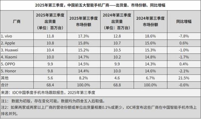 IDC最新数据显示,2025年三季度,中国『智能手机』出货量约6840万台,同比下降0.6%,连续六个季度保持负增长或零增长态势。