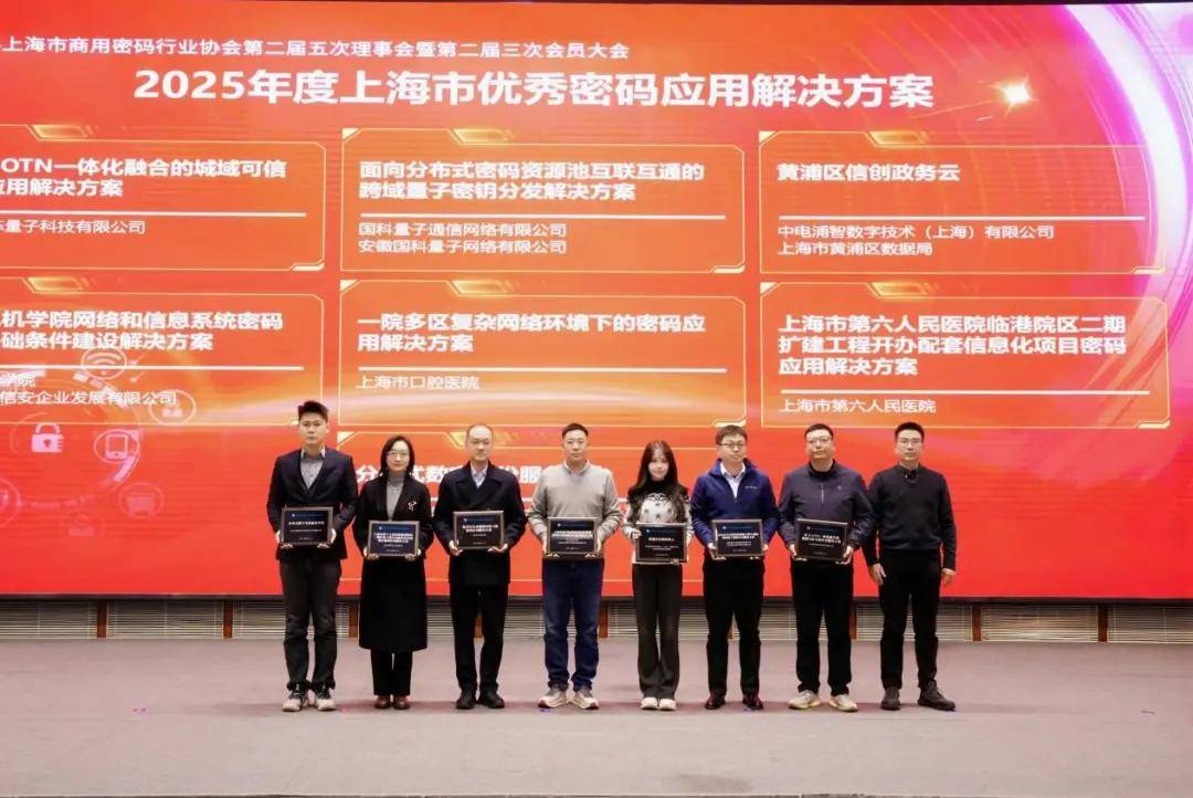 在大会的"2025年度上海市优秀密码应用解决方案"证书颁发仪式上,上海CA"分布式数字身份服务平台"荣获本年度优秀密码应用解决方案,并在现场接受了颁奖。