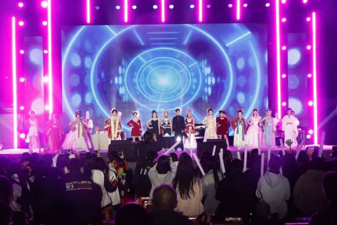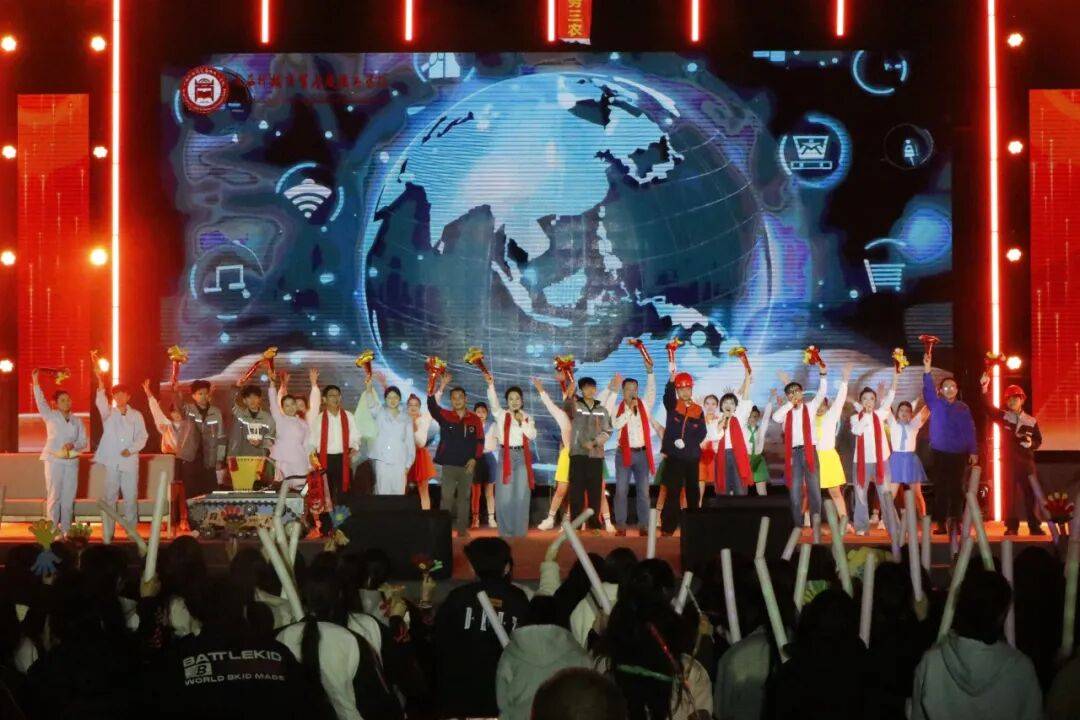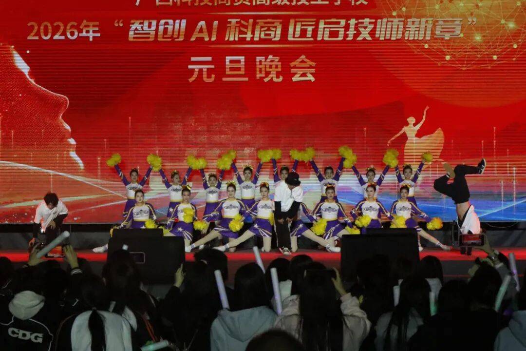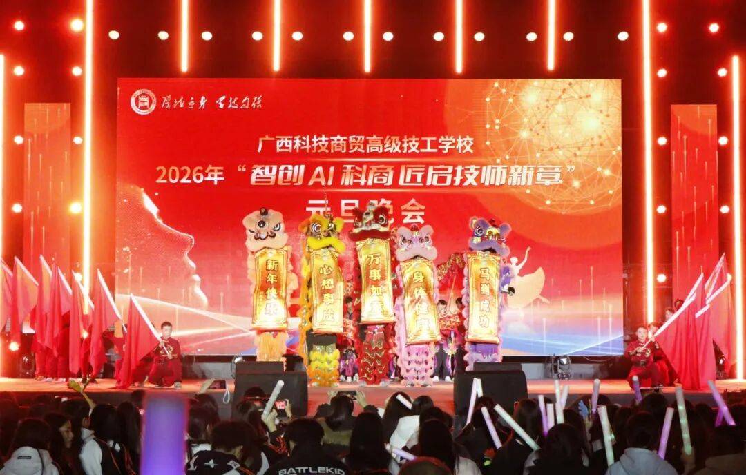 掌声、欢呼声、合唱声此起彼伏,荧光棒与灯光交织成一片星海。从传统醒狮到AI情景剧,从深情朗诵到活力街舞,整场晚会既是视听盛宴,更是广西科技商贸高级技工学校“智创”理念与“匠魂”文化的生动展示。