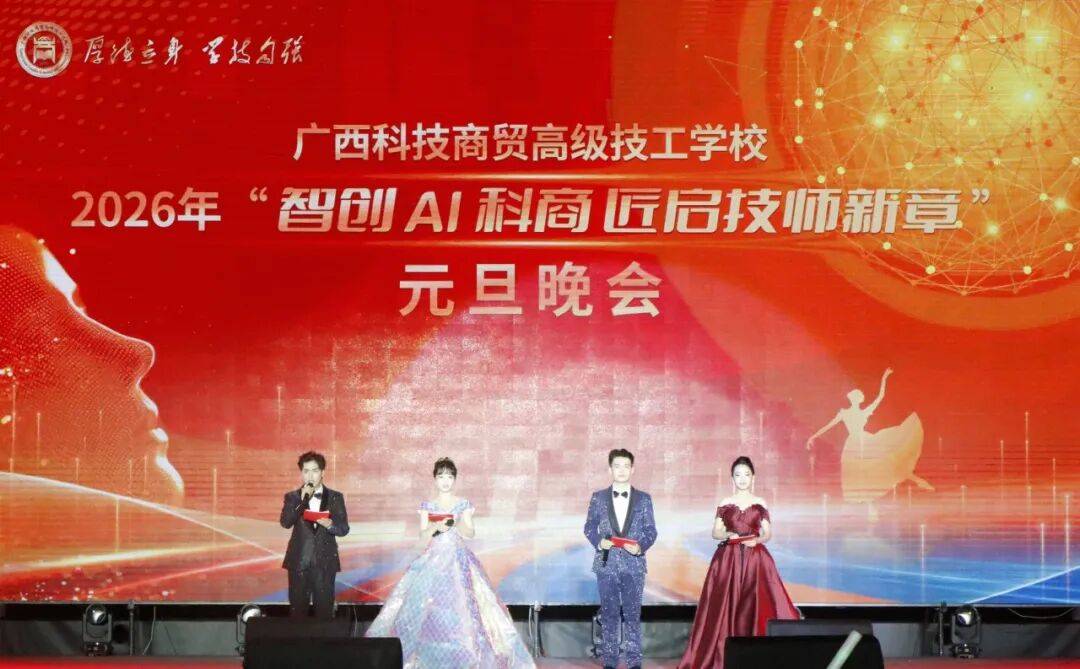 12月30日晚,广西科技商贸高级技工学校灯火璀璨、欢声雷动,2026年“智创AI科商 匠启技师新章”元旦晚会热烈上演!学校党总支书记、校长韦志军携班子成员与全校师生欢聚一堂,共同迎接充满希望的新一年。