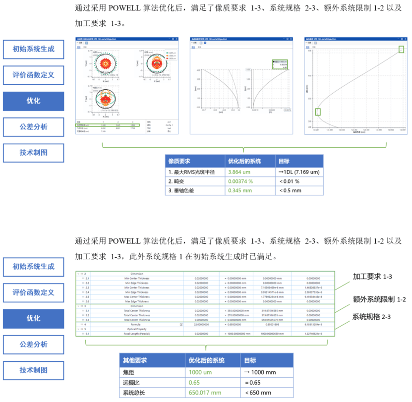 设计结果如下,像质,系统规格、额外系统限制以及加工要求均满足预期设计目标。