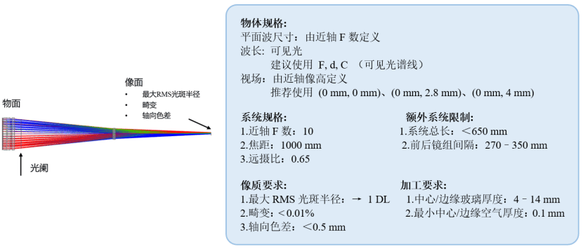 远摄型复消色差航拍物镜在航空摄影、遥感测绘及无人机航拍等高精度成像领域得到广泛应用。凭借其远摄光学结构与复消色差设计,该类镜头能够在远距离拍摄条件下实现卓越的空间分辨率和精确的色彩校正,同时兼具色差抑制能力强、成像清晰锐利及视场均匀性高等优势。在本案例中,将通过设计一个典型的远摄型复消色差航拍物镜,演示在 VLU 中的光学设计流程,包括初始系统建立、像质分析、评价函数定义、优化以及结果展示。