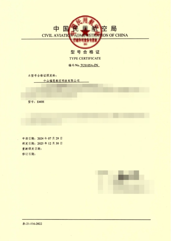 2024年7月31日,中国民用航空中南地区管理局正式受理福昆E40H型号合格证(TC)申请,同年8月组建审查组,12月开展E40H型号审查首次会议。2025年7月进行制造符合性检查并在局方目击下开展符合性验证试验,于12月完成最终评审,仅历时1年5个月,于2025年12月30日E40H正式获颁TC证。