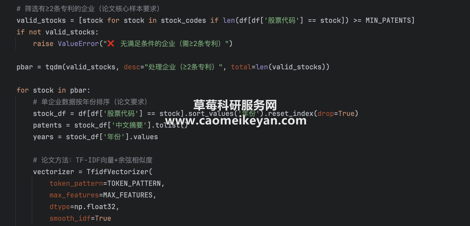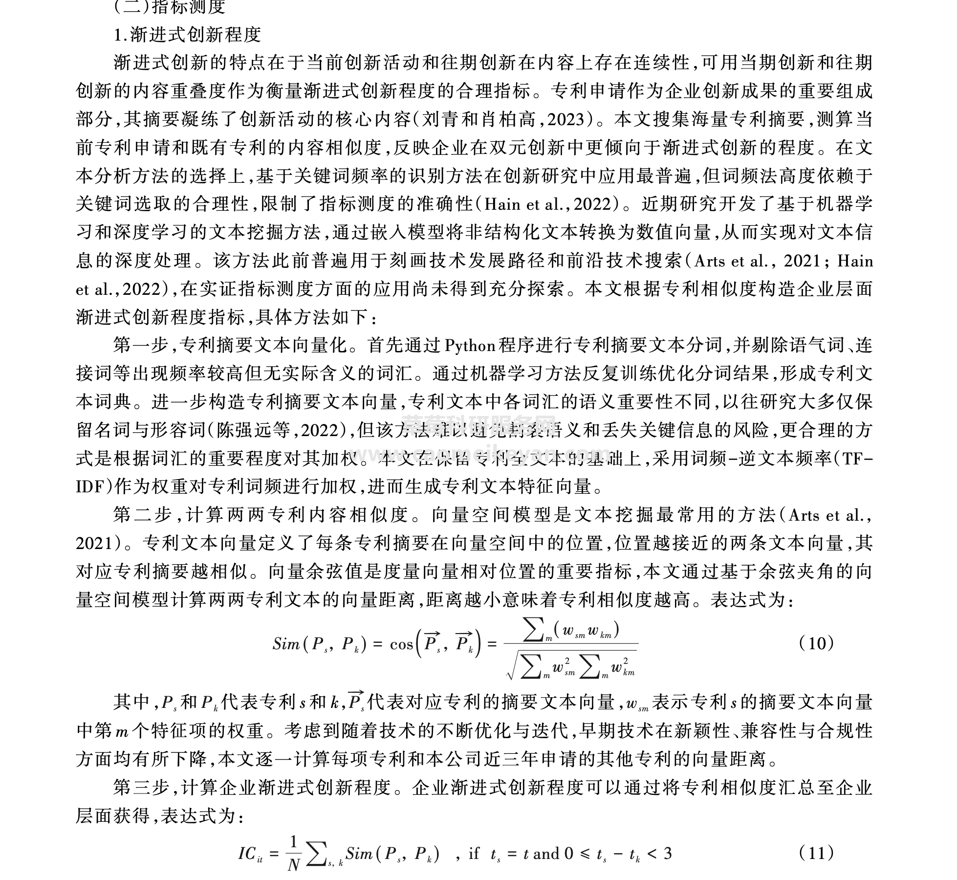 2、测算方式:参考顶刊《经济研究》孙雅慧(2024)老师的做法,渐进式创新的特点在于当前创新活动和往期创新在内容上存在连续性, 可用当期创新和往期创新的内容重叠度作为衡量渐进式创新程度的合理指标。专利申请作为企业创新成果的重要组成部分, 其摘要凝练了创新活动的核心内容 (刘青和肖柏高, 2023)。本文搜集海量专利摘要, 测算当前专利申请和既有专利的内容相似度, 反映企业在双元创新中更倾向于渐进式创新的程度。在文本分析方法的选择上, 基于关键词频率的识别方法在创新研究中应用最普遍, 但词频法高度依赖于关键词选取的合理性, 限制了指标测度的准确性 (Hain et al., 2022)。近期研究开发了基于机器学习和深度学习的文本挖掘方法, 通过嵌入模型将非结构化文本转换为数值向量, 从而实现对文本信息的深度处理。该方法此前普遍用于刻画技术发展路径和前沿技术搜索 (Arts et al., 2025; Hainet al., 2022), 在实证指标测度方面的应用尚未得到充分探索。本文根据专利相似度构造企业层面渐进式创新程度指标, 具体方法如下:第一步, 专利摘要文本向量化。首先通过 Python 程序进行专利摘要文本分词, 并剔除语气词、 连接词等出现频率较高但无实际含义的词汇。通过机器学习方法反复训练优化分词结果, 形成专利文本词典。进一步构造专利摘要文本向量, 专利文本中各词汇的语义重要性不同, 以往研究大多仅保留名词与形容词 (陈强远等, 2022 ), 但该方法难以避免割裂语义和丢失关键信息的风险, 更合理的方式是根据词汇的重要程度对其加权。本文在保留专利全文本的基础上, 采用词频-逆文本频率 (TF-IDF ) 作为权重对专利词频进行加权, 进而生成专利文本特征向量。具体做法和公式如下图文献所示,与文献做法一致!