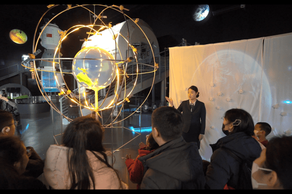 本次双享会的核心板块之一,是沉浸式游园剧《问天苍穹・逐梦星辰》。该剧首创“展厅即舞台,展品即道具”模式,将“太空探秘”实体展厅转化为可交互戏剧场景,在全息光影与环绕音效的精准引导下,让观众沿剧情动线移步换景,将小球大世界、火箭模型等展项融入情节,打破传统展览静态边界。剧目以“跨时空对话”串联清代女天文学家王贞仪、钱学森、杨利伟、翟志刚、王亚平等古今航天相关人物,在航天科技集团专家指导下,复原1:1航天服并特别陈列一台与钱学森先生当年所用同厂同型号的手摇式计算机,借助全息光影与环绕音效营造“虚实交织”氛围,让观众在行走中感受“活的航天史诗”。