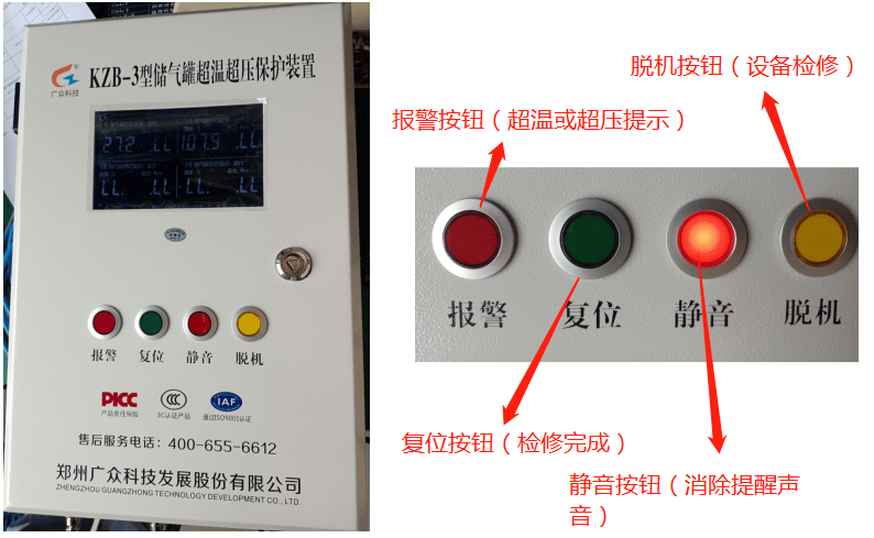 前面板标配1枚报警指示灯及3枚功能控制按钮,功能划分清晰明确,操作简单易懂。其中,报警指示灯专属用于实时反馈装置报警状态,报警触发时即时亮起,提醒操作人员及时处置;3枚功能按钮分别为复位键、静音键、脱机键,各按键功能定义如下:脱机键专为装置调试场景设计,切换至脱机状态可简化调试流程,提升调试效率,需特别注意:脱机状态下装置保护功能将自动关闭,调试完成后需及时切换至正常工作模式;当储气罐出现超温、超压等异常情况触发报警时,按下静音键可快速关闭报警音,避免噪音干扰作业环境;按下复位键可执行故障复位操作,助力设备恢复正常运行。