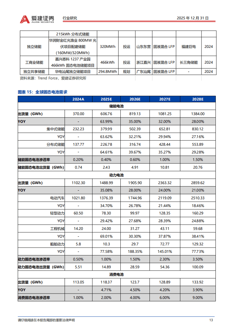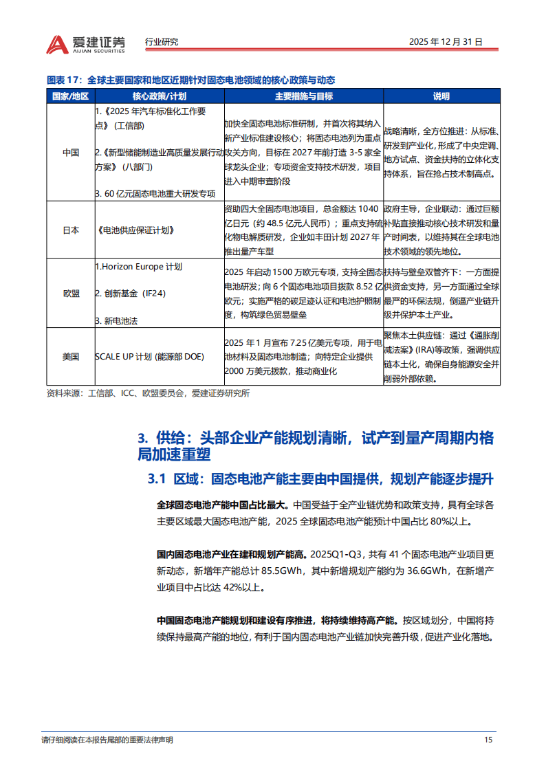 供给端,中国占据全球80%以上的固态电池产能,2025年1-9月新增相关产业项目41个,新增年产能达85.5GWh。全球头部企业量产规划清晰,2027年成为关键节点,Solid Power计划2026年底量产,丰田、三星、清陶能源等预计2027年初实现量产。国内电池厂已建成半固态电池量产线,车企通过自研或合作模式推进车型落地,海外车企则聚焦全固态电池研发与路测。