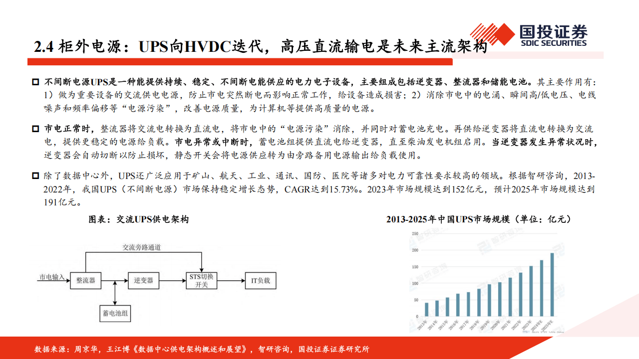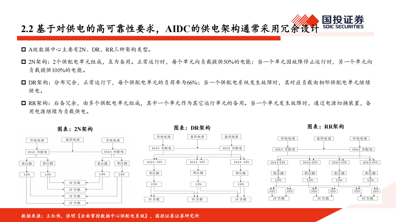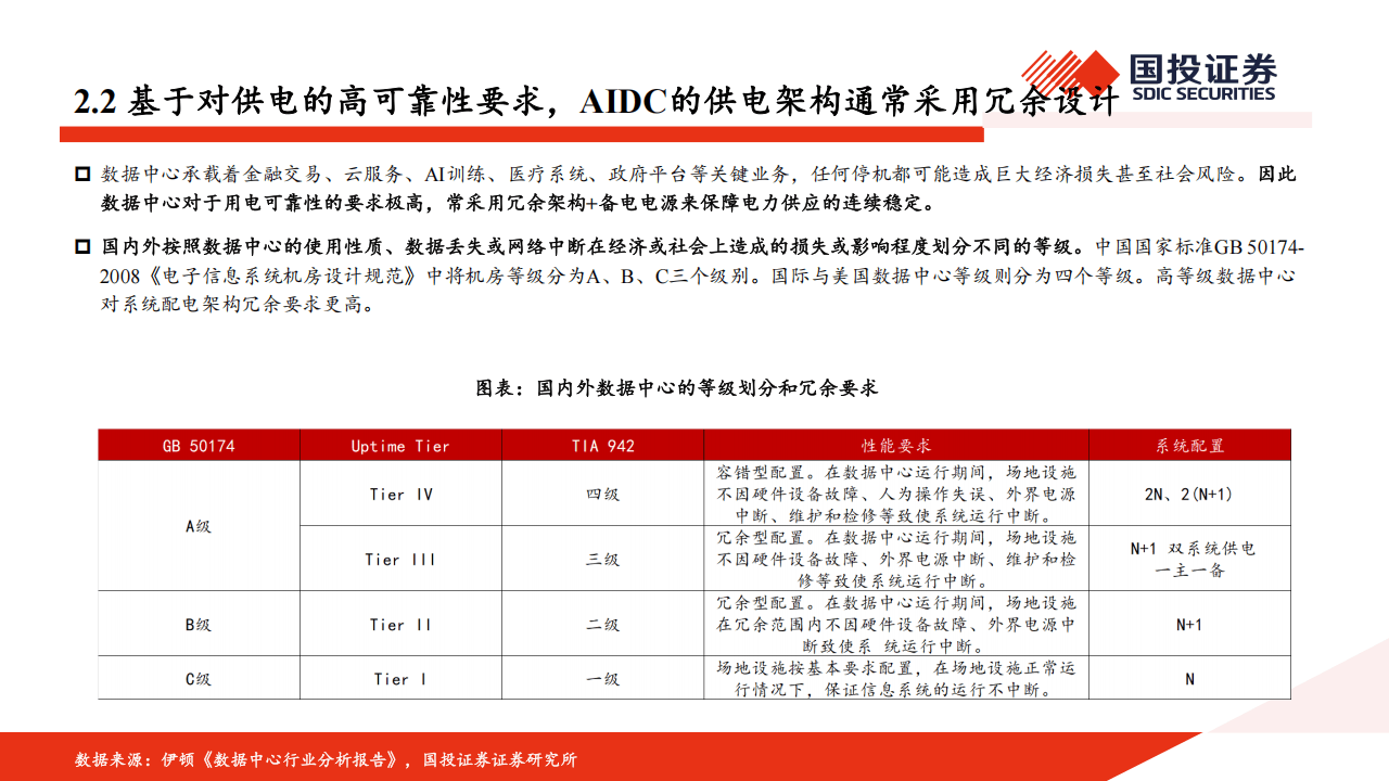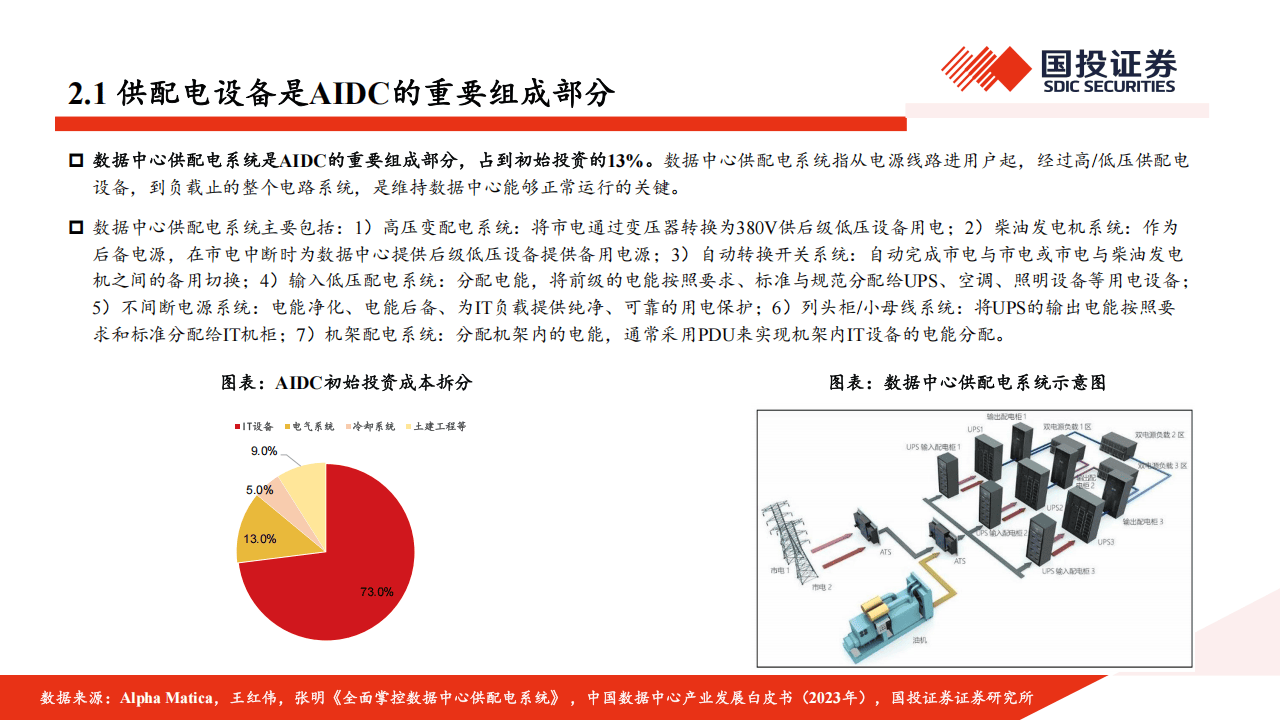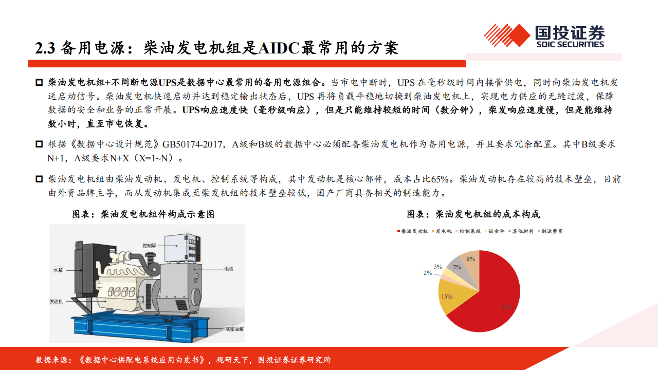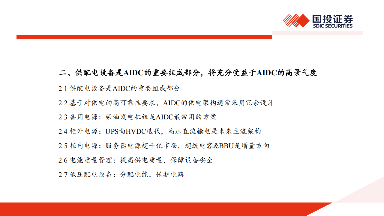 供配电设备是AIDC的重要组成部分,占初始投资的13%,涵盖高压变配电系统、后备电源等多个子系统。基于供电高可靠性要求,AIDC供电架构常采用冗余设计,柴油发电机组是主流备用电源方案,2024-2028年国内相关市场规模将从81.99亿增长至182.11亿元。柜外电源领域,UPS向HVDC迭代,高压直流输电成未来主流,2025-2030年HVDC市场规模CAGR高达86%,800V HVDC供电架构的SST方案因优势显著,有望成为最终方向。柜内电源方面,『服务器』电源市场规模2030年将超千亿,超级电容和BBU成为增量方向。此外,电能质量管理设备和低压配电设备在AIDC中发挥重要作用,保障供电质量和电路安全。