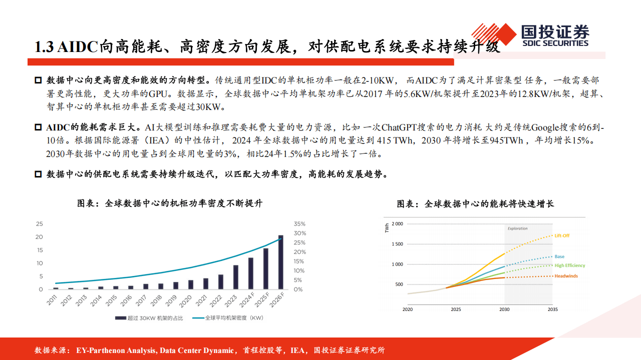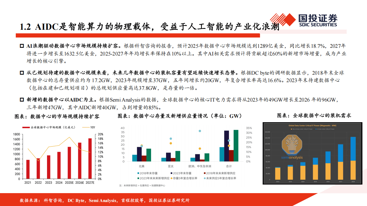 AIDC作为智能算力的主流物理载体,专为支持AI应用设计,配备高性能计算资源,受益于AI产业化浪潮。与传统IDC相比,AIDC在承载业务、算力类型、技术架构和散热模式等方面存在显著差异,单机柜功率密度更高,多采用液冷或风液混合散热。『数据中心』市场规模持续扩容,2025年预计达1289亿美金,2027年将增至1632.5亿美金,AI相关需求贡献超60%新增市场增量。全球『数据中心』核心IT电力需求增长显著,2023-2026年新增47GW中,AIDC占85%。同时,AIDC向高能耗、高密度方向发展,对供配电系统要求持续升级,2030年全球『数据中心』用电量将达945TWh,占全球用电量的3%。