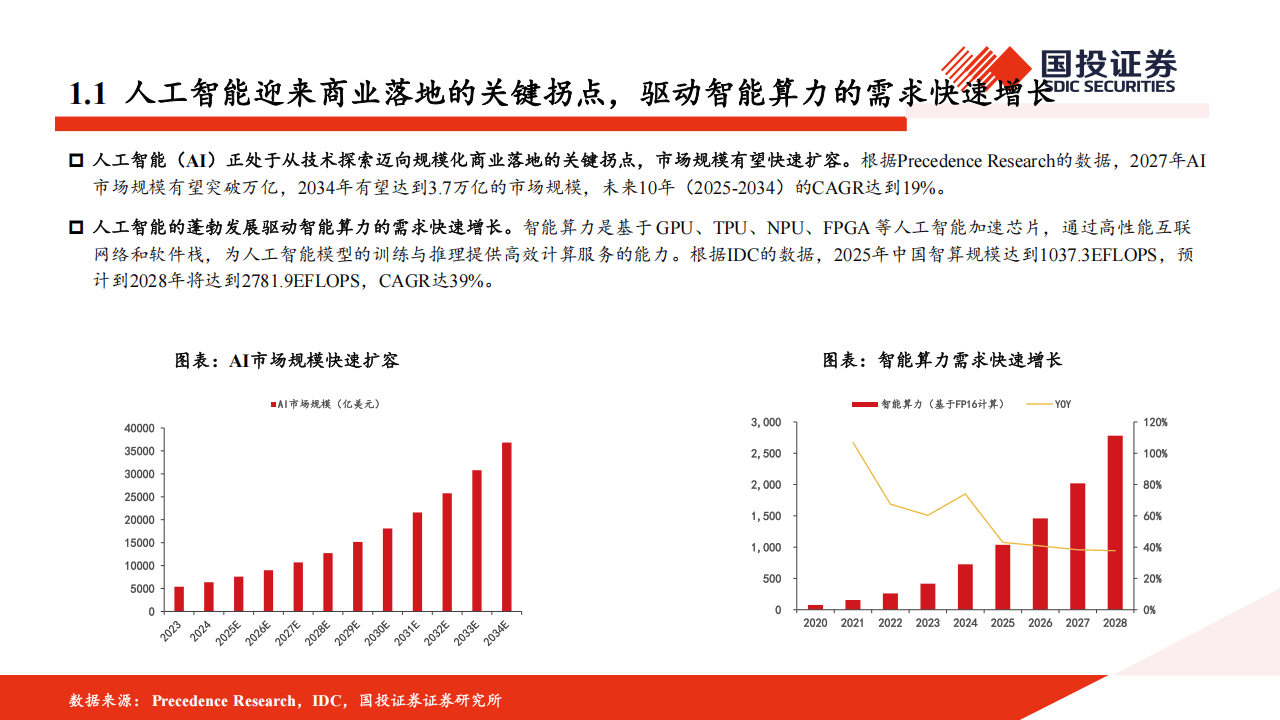 AI正处于从技术探索迈向规模化商业落地的关键拐点,市场规模有望快速扩容,2027年有望突破万亿,2034年预计达3.7万亿,2025-2034年CAGR达19%。人工智能的蓬勃发展驱动智能算力需求激增,2025年中国智算规模达1037.3EFLOPS,2028年将增至2781.9EFLOPS,CAGR达39%。