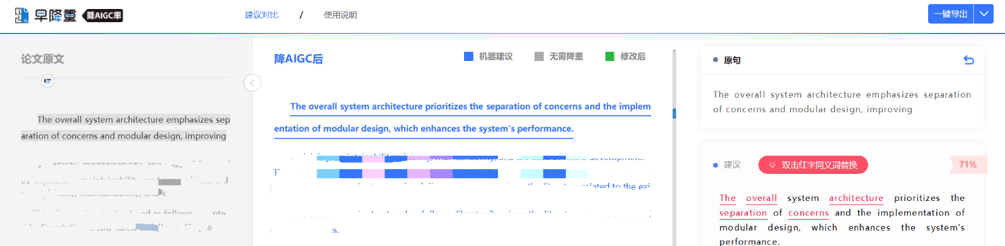 如果是AI率太高或时间比较紧的时候,可以先借助专业降AI率工具,先把大面积的基础AI率降下来,再人工结合工具修改。
