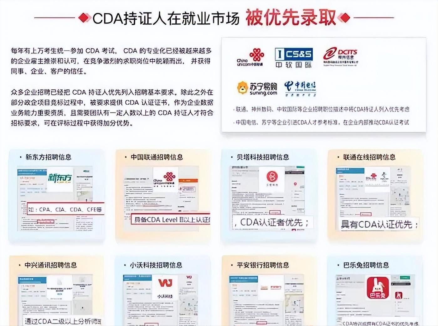 国内众多知名企业如中国联通、央视广信、德勤、苏宁等,将CDA持证人列入优先考虑范围,或为员工提供考试补贴