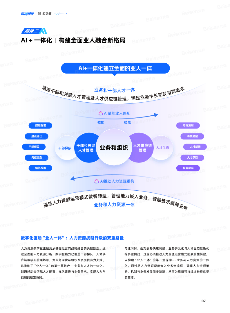 北森一体化HR SaaS与AI Family解决方案,以People Science与AI深度融合为核心优势,覆盖员工全生命周期管理,已服务超6000家中大型企业,70%的中国500强企业持续选择。白皮书的核心价值在于,帮助企业跳出“为『数字化』而『数字化』”的误区,推动HR从运营支持角色升级为战略共创角色,以数智化力量激活组织潜能,构建可持续的人才优势与核心竞争力。