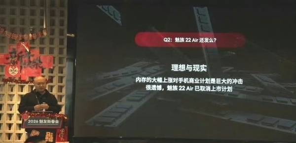 在这次活动上,星纪魅族集团中国区CMO万志强宣布,内存的大幅上涨对手机商业计划是巨大的冲击,所以很遗憾,魅族22 Air取消上市计划。
