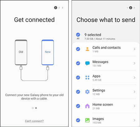 在旧手机上点击“发送数据”>“数据线”选项,在新手机上点击“接收数据”>“数据线”选项。使用 USB 数据线和 USB 连接器将您的 Pixel 连接到 Android。他们将被连接起来。