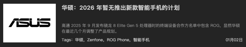 前段时间,有爆料称华硕在 2026 年里,暂无推出新款『智能手机』的计划。