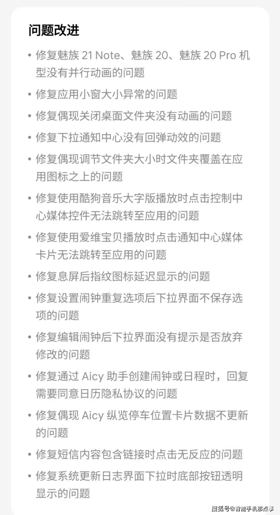 还有就是此次的更新修复了不少的问题,比如魅族21 Note/20/20 PRO无并行动画、桌面文件夹关闭无动画、通知中心下拉无回弹动效。