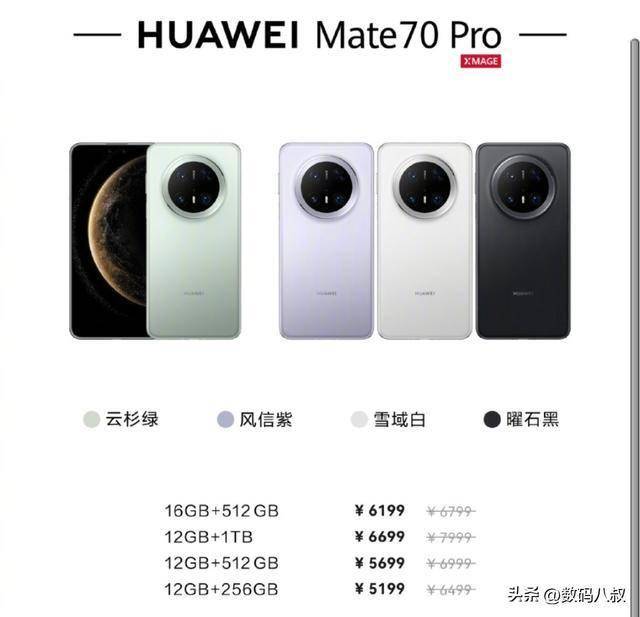 - Mate 70 Pro:标准版同样给力,1TB版本从7999元降至6699元,512GB版本降至5699元,而入门的256GB版本更是来到了5199元。