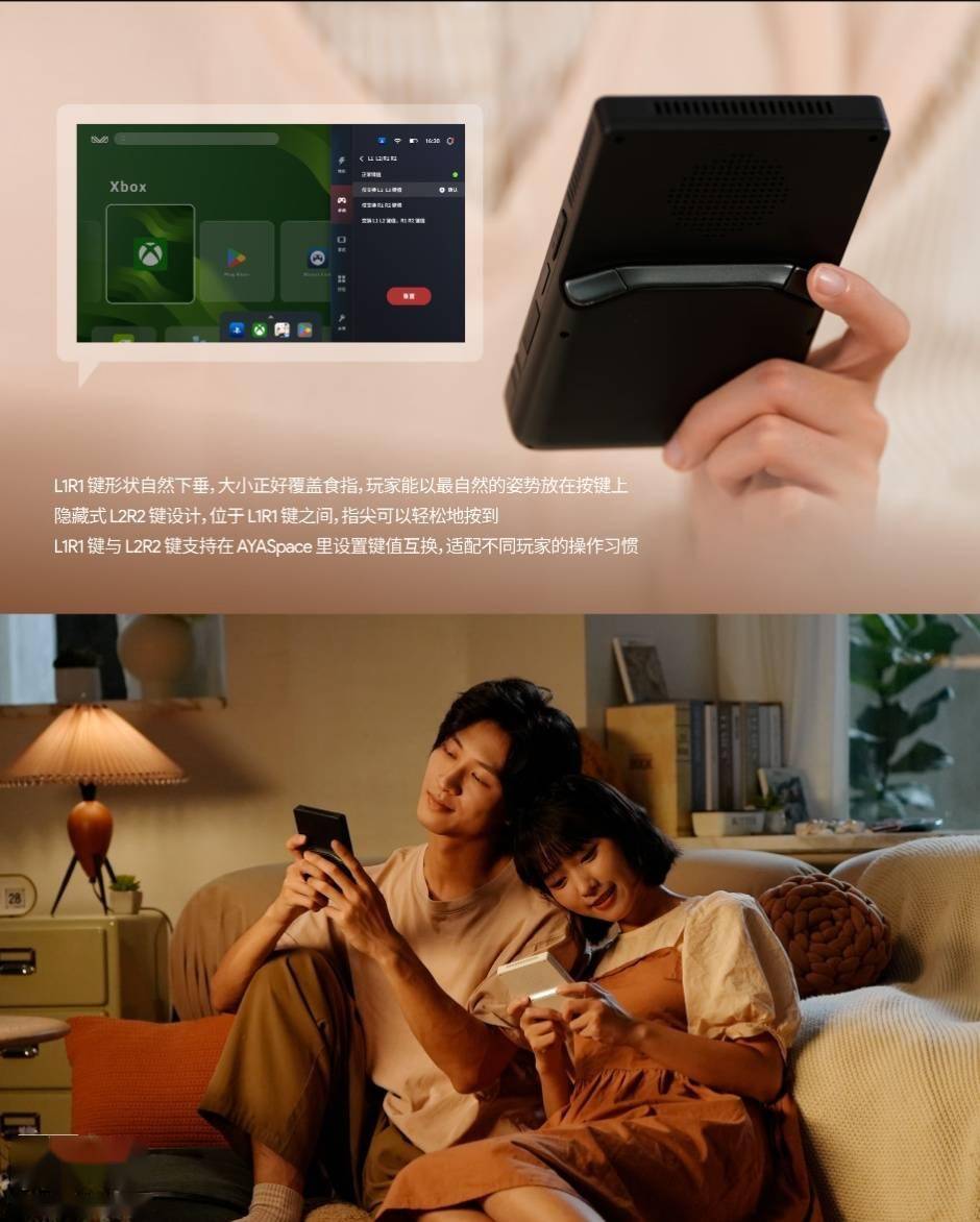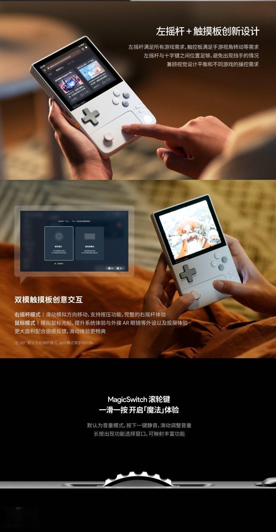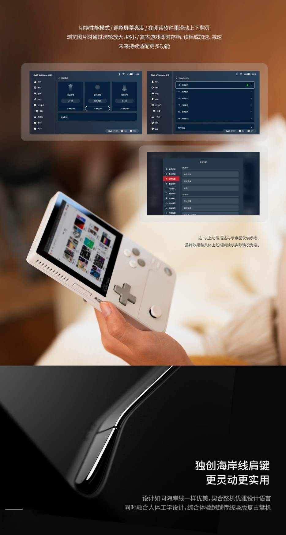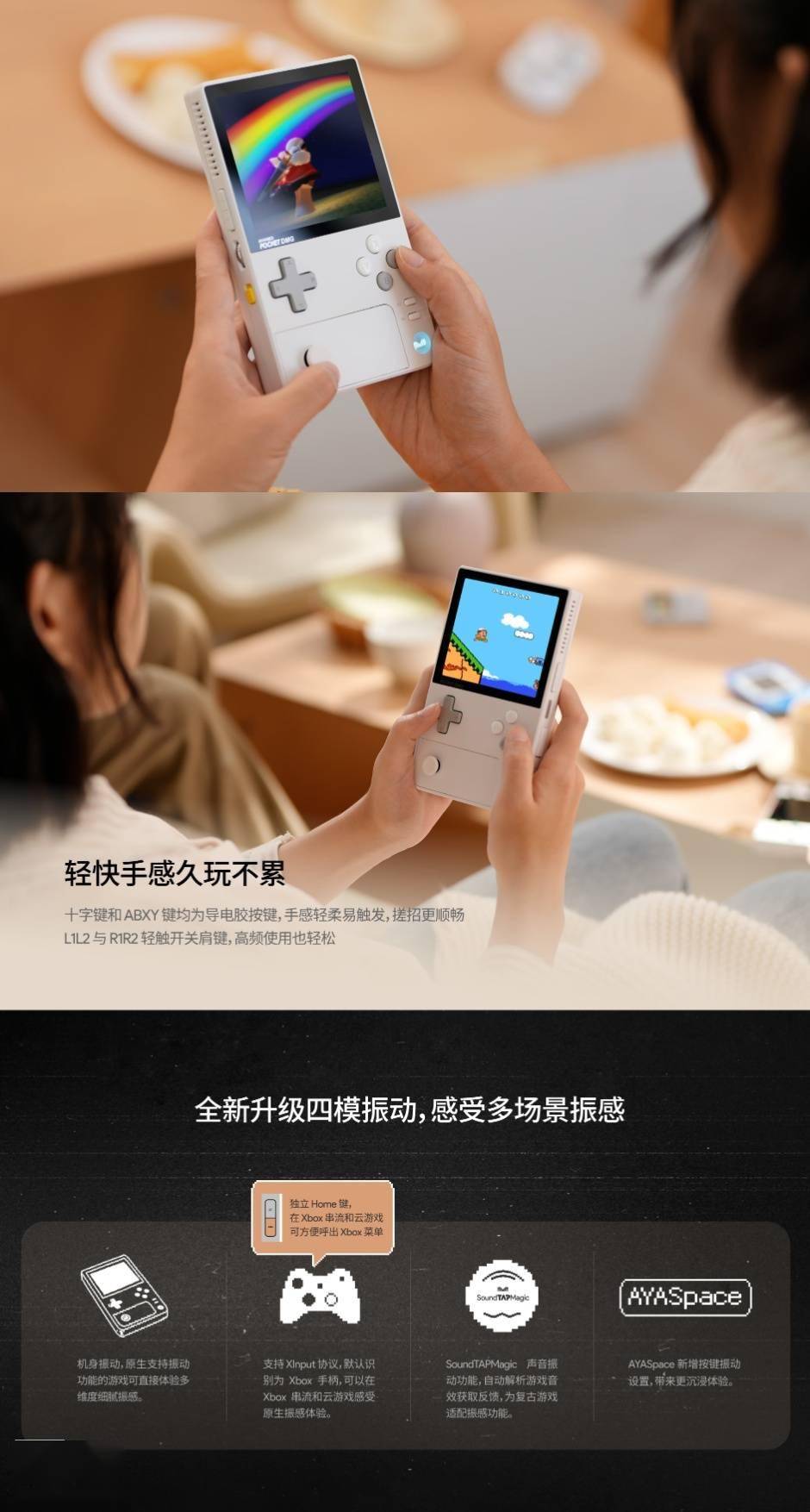 据介绍,这款游戏机重量 278g,可带来更加紧凑的优雅手感,机身底部拥有大曲率 R 角设计,可让手掌握持区域不硌手,正面配备十字键、ABXY 键、SELECT/START 按键,还带有物理左摇杆 + 触摸右摇杆,满足复古游戏与现代手游的双重需求。