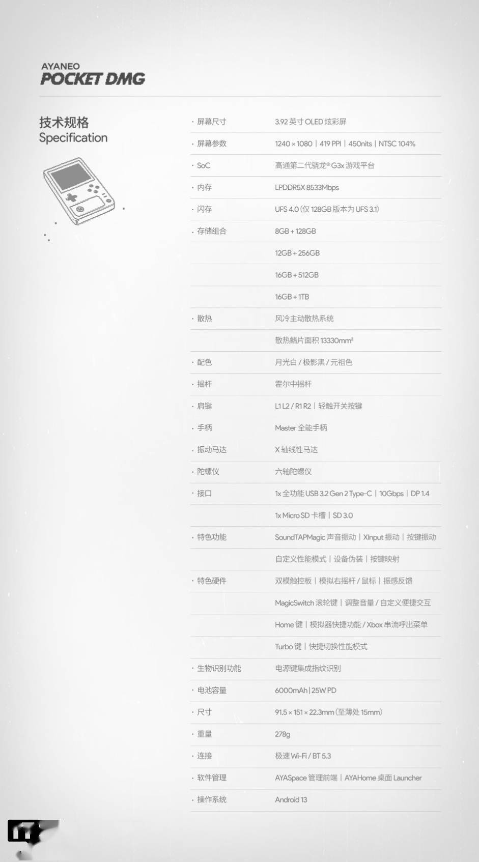 此外,这款掌机还带有 LPDDR5X 内存、UFS 4.0 存储空间,搭载大尺寸散热风扇,确保性能持续稳定释放,内置 6000mAh 电池,支持 PD 快充。
