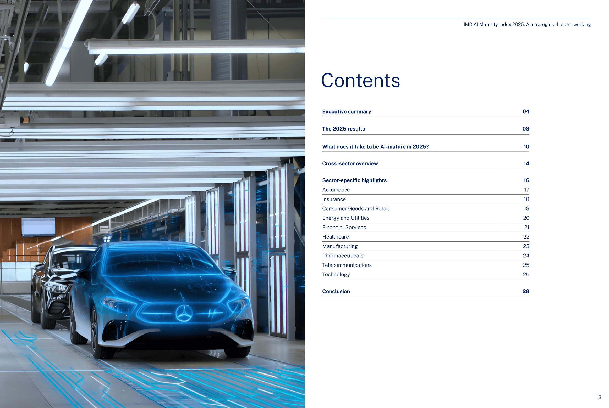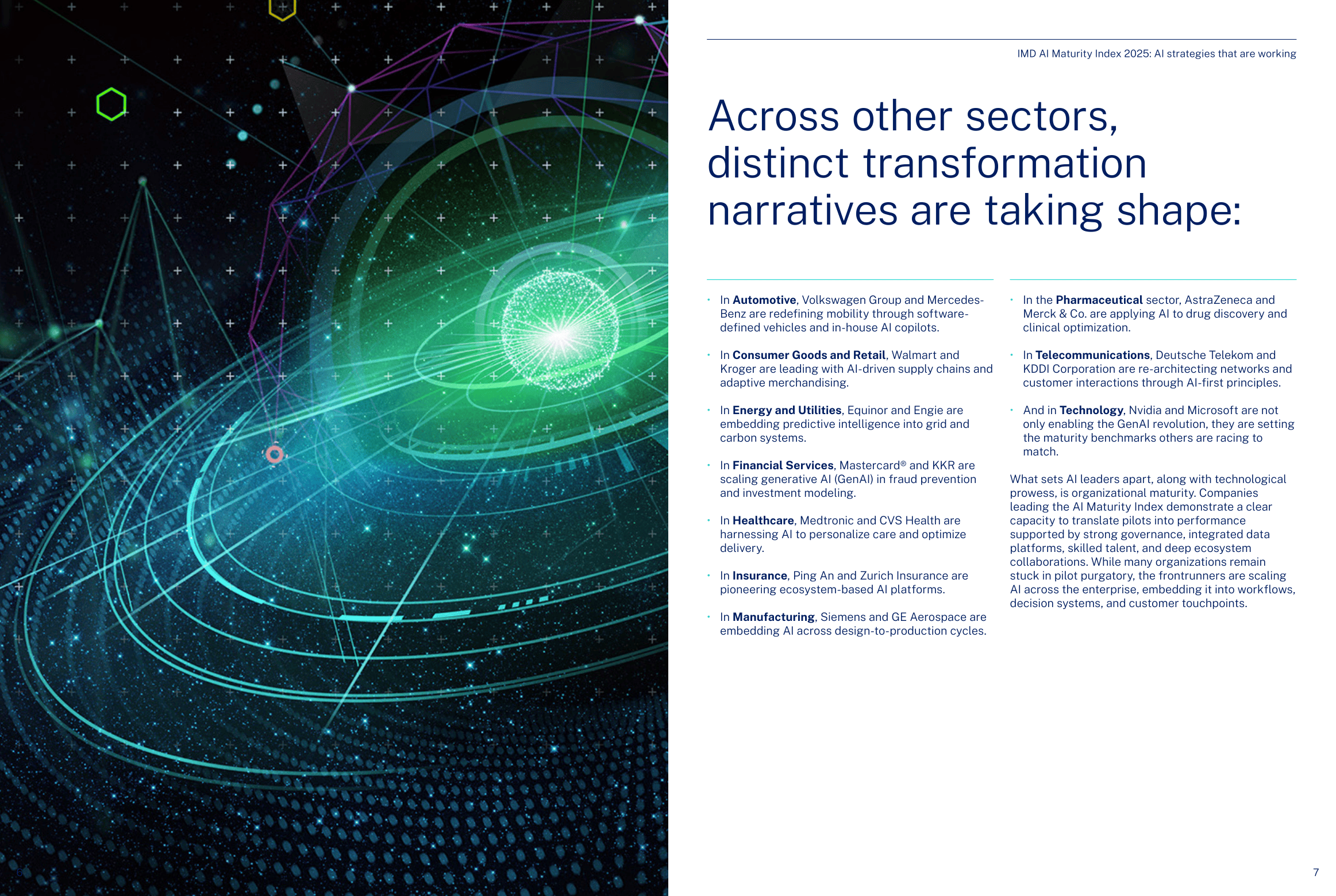 导读:2025 年人工智能进入规模化落地阶段,IMD 人工智能成熟度指数聚焦全球 300 家顶尖企业,从高管支持、技术基建、运营应用、人才培养、伦理风控五大维度评估 AI 成熟度。报告核心发现,AI 竞争优势已从技术试点转向规模化部署,战略对齐比算法本身更关键,高成熟度企业在营收与市值增长上表现突出。金融服务行业表现亮眼,32 家企业跻身指数前 100,超越科技行业的 21 家,成为企业级 AI 规模化应用的核心阵地。十大行业呈现差异化转型路径,科技巨头主导基础设施建设,汽车行业聚焦软件定义车辆,医疗领域推进个性化诊疗,制造业则将 AI 嵌入全生产周期。领先企业的共性在于组织成熟度,通过强化治理架构、整合数据平台、培育专业人才、深化生态合作,实现试点向绩效转化。未来企业需突破试点困境,以 C-suite 级 AI 领导力为核心,构建全链路治理与人才体系,解锁 AI 全量价值。