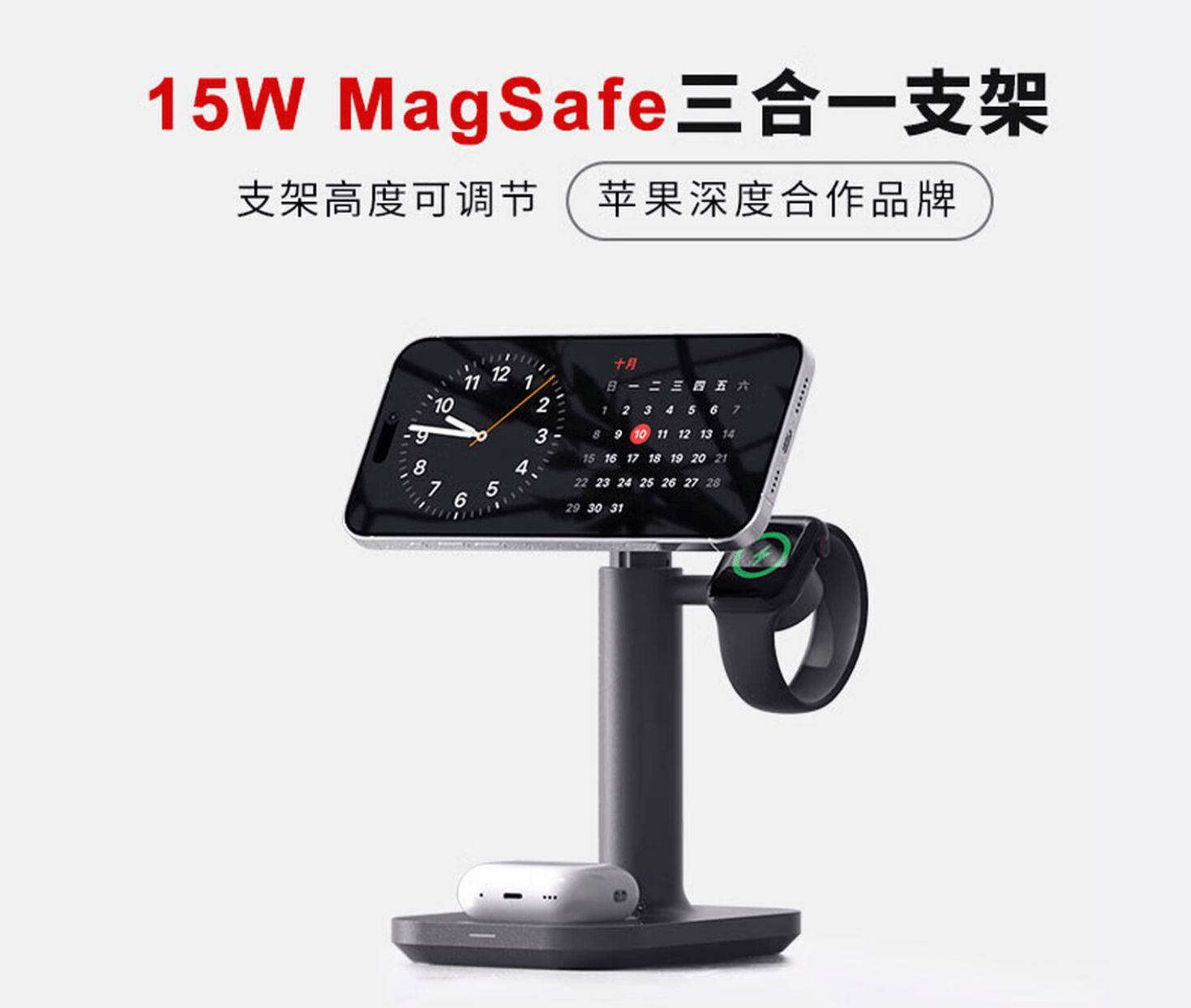 mophie三合一可伸缩磁吸无线🛜充电器集成苹果MagSafe原装模组,为iPhone提供高达15W快充,通过苹果MFM认证。支持Stand By模式,可以在充电时变为闹钟使用。产品采用可伸缩支架,高度可调节,让观看时颈部得到放松,更符合人体工学设计。底座加重钢材质,重心更低摆放更稳。三合一设计使得iPhone、『Apple Watch』和AirPods充电一个搞定。