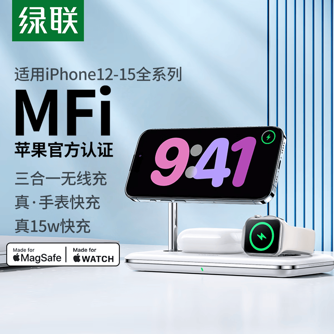 绿联这款三合一多功能无线🛜充电器整体为白色搭配银色金属亮色,干净醒目且辨识度很高。主体由底座、手机无线🛜充模块以及手表无线🛜充模块三部分组成。内置两个苹果官方的磁吸无线🛜充电模块,分别通过了苹果MFM和MFW认证,充电功率最高也能达到15W/5W/5W。手机和手表无线🛜充模块都是可调节设计,磁吸充电过程中能根据场景选择合适的角度,提升使用体验。