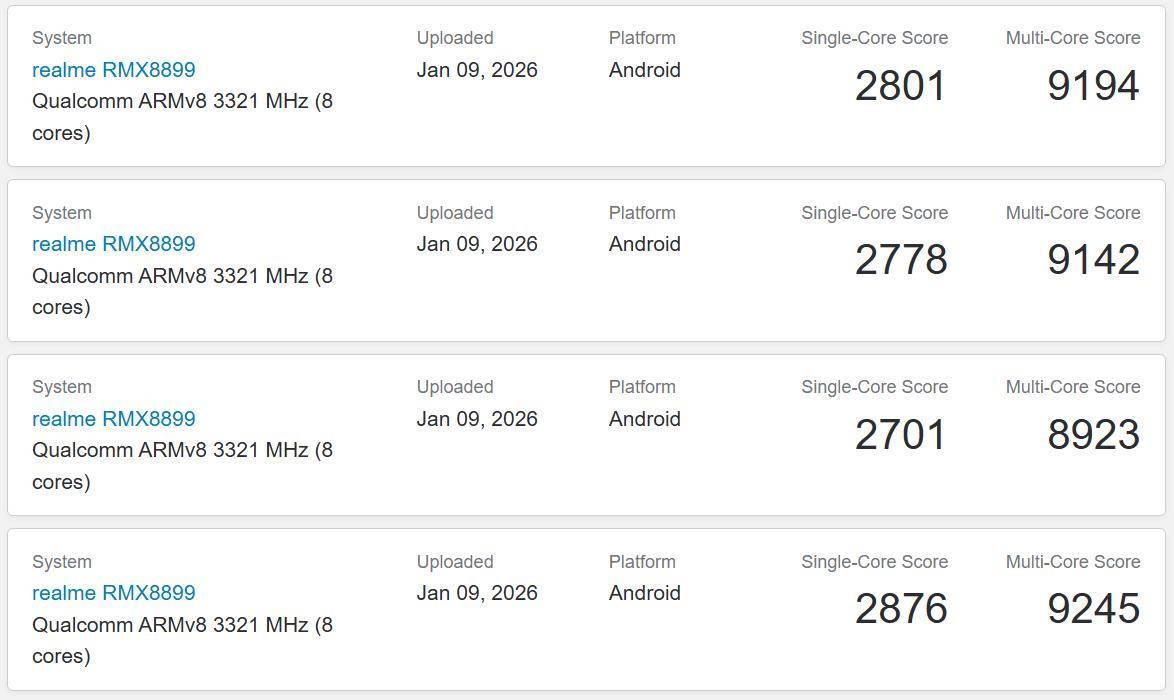1 月 10 日消息,型号为“RMX8899”的 realme 真我手机现身 GeekBench 跑分库,共有 4 条记录,按照多核得分排序,最高一条记录单核成绩为 2876 分,多核成绩为 9245 分。基于此前 GSMA IMEI 数据库信息,该型号对应 realme 真我 Neo8 手机。