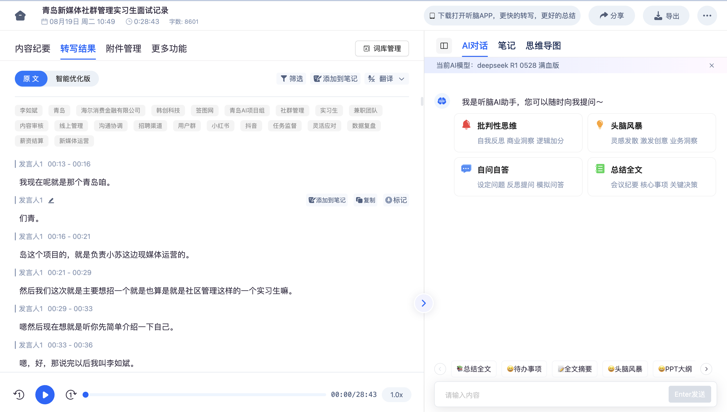 先说说它的实时转写能力,用的是最新一代AI语音大模型,双麦克风降噪在开放办公区的会议也能准确识别,动态增益调节让远程参会者的声音和现场一样清晰。上周我在开放办公区开临时项目会,背景有咖啡机和同事的讨论声,听脑AI依然准确识别了“5月25日前提交需求文档”的任务,没有任何错误,实测转写准确率95%以上,比其他工具高10%-15%。