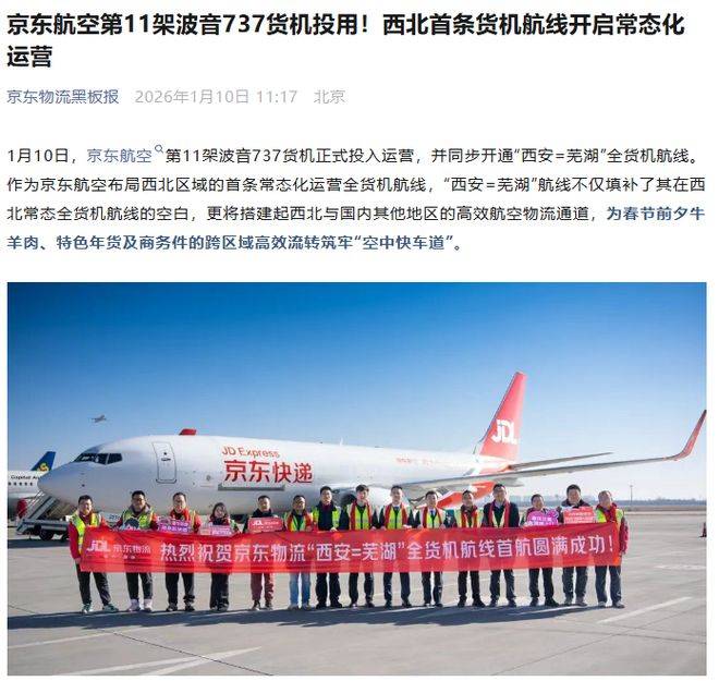 1 月 10 日消息,京东物流今日宣布,京东航空第 11 架波音 737 货机正式投入运营,并同步开通“西安 = 芜湖”全货机航线。
