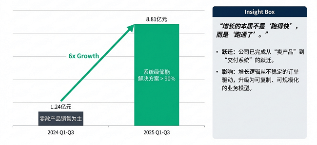 这一爆发式增长的内核是业务结构的彻底转型:2024年的收入尚且依赖单纯产品销售,而到了2025年,系统级储能解决方案(Integrated ESS)已成为贡献超过九成收入的绝对主力 。