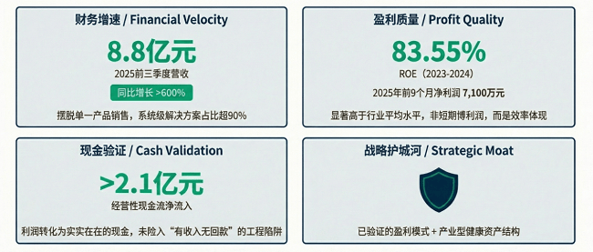 从最新的财务表现来看,公司在2025年迎来了一个极为清晰的经营拐点,前三季度约 8.8亿元 的营业收入与约 7,100万元 的净利润,2023-2024年化约 83.55% 的平均股东权益回报率(ROE) 。