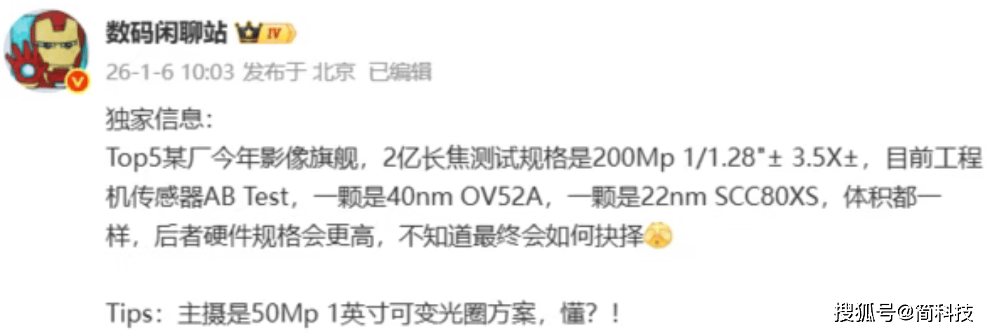 此前也有爆料称,某手机厂商的影像旗舰正在测试一套 2 亿像素大底潜望式长焦镜头,以及一颗 5000 万像素 1 英寸可变光圈主摄。