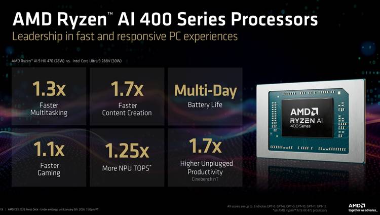 AMD也拿出了与Intel Core Ultra 9 288V之间的性能对比,拿出的处理器为AMD 锐龙AI 9 HX 470,在功耗几乎相同的情况下,AMD 锐龙AI 9 HX 470处理器在多线程性能上提升了30%,内容创作速度提升70%,游戏速度提升10%,NPU算力提升了25%,并且续航表现也更加出色,可以说是生产力玩家的不二之选,预计搭载AMD 锐龙AI 400系处理器的笔记本📓将于2026年第一季度和大家见面。