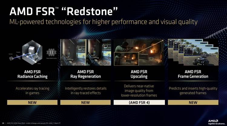 在软件层面,AMD也在2025年末带来了FSR Redstone,让用户不用在选择画质与游戏帧率中纠结,得益于先进的机器学习技术,玩家可以兼顾光追画质以及高游戏帧率,例如在《使命召唤》中,由FSR Redstone带来的游戏帧率提升幅度可以达到4.7倍。目前一共有超过200多款不同的游戏已经可以使用FSR Redstone,预计到2026年会有更多的游戏支持这项技术。